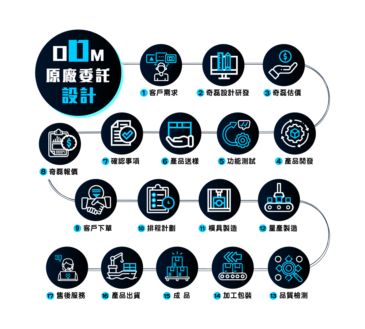 奇磊ODM服務流程:確認客戶需求後進行評估與報價,當您同意並下單,即正式進入產品的設計與研發階段,產品功能實測完成,奇磊將送樣給您確認,承認完成後,將規劃排程以利生產、交貨流暢。至生產階段我們將為客戶層層把關,從量產到包裝安排至少三次以上的品質檢測方才行出貨;並在交貨完畢後,提供完善的售後服務。